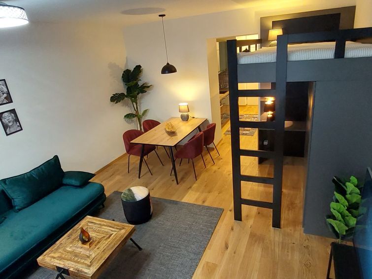 "Premium Apartment MariaHilf 2", 1-Zimmer-Wohnung 42 m2 im 2. Stock. Objekt geeignet für 4 Erwachsene. Hell, vollständig renoviert im Jahre 2023, modern und geschmackvoll eingerichtet: Eingang. Offenes Wohn-/Schlafzimmer mit 1 x 1 Etagenbetten (150 cm, Länge 200 cm), 1 Ausziehbett (2 Pers.), Kabel-TV, Flachbildschirm, Radio, CD und Ventilator. Küche im Eingang (4 Kochplatten, Backofen, Geschirrspüler, Toaster, Wasserkocher, elektrische Kaffeemaschine). Bad/WC. Heizung. Holzdielenboden. Seitliche Sicht. Zur Verfügung: Waschmaschine, Bügeleisen, Babybett, Haartrockner. Internet (WLAN, gratis). Bitte beachten: Wohnung auf Strassenseite. Nichtraucher-Unterkunft. Etagenbett (150cm breit) ist ein Hochbett. Highspeed-Internet.