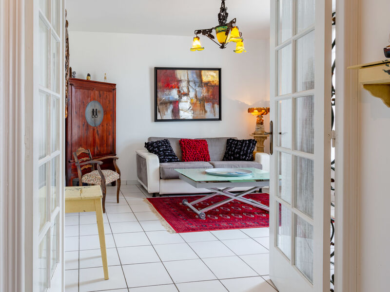 Appartement 2-kamers 45 m2, op verhoogde begane grond. 1 kamer met 1 2-pers divanbed (1 x 130 cm, lengte 190 cm), 1 x 1 stapelbedden (90 cm, lengte 190 cm). Woon-/eetkamer met 1 2-pers divanbed (1 x 140 cm, lengte 190 cm), eettafel en TV (Flatscreen TV). Keuken (mini-oven, oven, 2 keramische glas kookplaten, broodrooster, waterkoker, magnetron, elektrische koffiemachine) met kleine eettafel. Badkamer, aparte WC. Uitzicht in de verte op zee. Ter beschikking: Internet (WiFi, extra). Niet rokers woning. Maximaal 1 huisdier/hond toegestaan. Aanbod door een particulier volgens art. 155, IV van CGI.