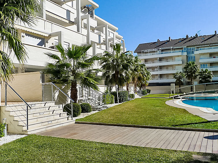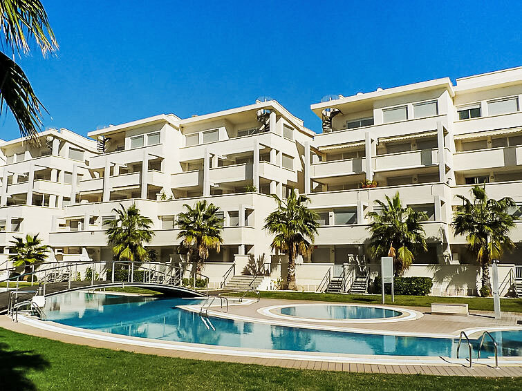 Groot flatgebouw "Elegance", van 4 verdiepingen, bouwjaar 2006. Aan de rand van de plaats, 700 m van het centrum van Dénia, 500 m van zee. Voor medegebruik: tuin met gazon, openluchtzwembad (40 x 12 m, 40 - 210 cm diepte, seizoensgebonden beschikbaarheid: 01.Jan. - 31.Dec.) met trap. Kinderzwembad, buitendouche. In het complex: sauna, fitnessruimte, speelkamer, lift (voor medegebruik). Trappenweg (15 treden) naar het huis. Parkeerplaats. Winkel 1 km, supermarkt 1 km, bar 400 m, bushalte 400 m, zandstrand 500 m. Jachthaven 2 km, golfterrein (18 holes) 8 km, tennis 500 m. De eigenaar accepteert geen jeugdgroepen.
